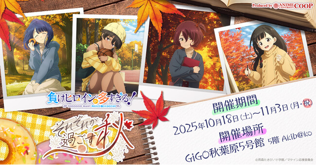 TVアニメ『負けヒロインが多すぎる!』のポップアップイベントがこの秋、GiGO秋葉原5号館をはじめ、大阪・名古屋・福岡の全国4会場で開催決定!テーマは“それぞれが過ごす秋”。食欲・スポーツ・読書・芸術など、秋の魅力を描いた新規描き下ろしイラストを使用したグッズが多数登場します。会場限定特典やくじ、たい焼きやドリンクのノベルティ企画も盛りだくさん。秋色に染まるヒロインたちのひとときを、ぜひ会場でお楽しみください。