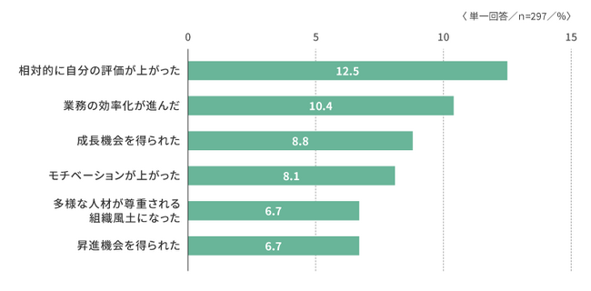 - 一方で、恩恵を受けたと感じた理由として最も多かったのは「相対的に自分の評価が上がった」(12.5%)でした。自由記述回答では、主に同僚として「静かな退職者」と働く場合の恩恵が目立ちました。加えて、業務の効率化や組織風土の変化といった、職場全体にもたらされる恩恵を挙げる回答も確認されました。
