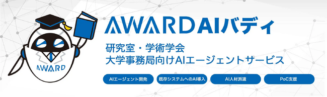[画像1: https://prcdn.freetls.fastly.net/release_image/101548/7/101548-7-561b3b6363b55858cd0bfc20cae08c2e-2396x709.png?width=536&quality=85%2C75&format=jpeg&auto=webp&fit=bounds&bg-color=fff ]研究室・学術学会・大学事務局向けAIエージェント「AWARD AIバディ」