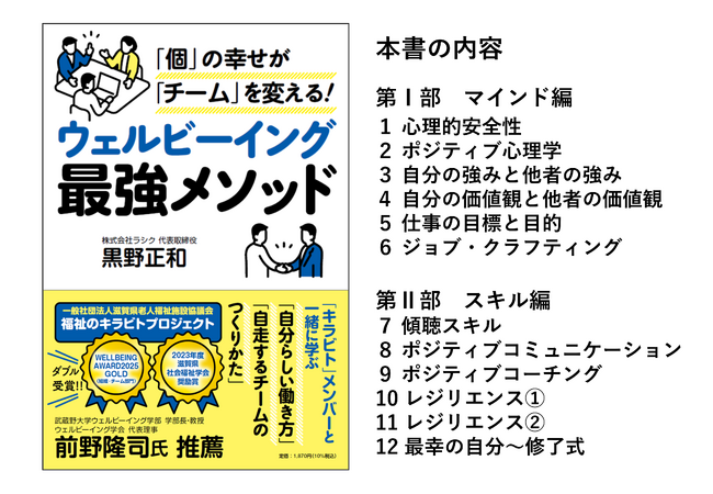 株式会社ラシク(本社:京都府京都市、代表取締役:黒野正和)は、当社の人財育成コンサルティング支援のもと、一般社団法人滋賀県老人福祉施設協議会が実施する「福祉のキラビトプロジェクト」が「ウェルビーイング・アワード2025 組織・チーム部門」でゴールドを受賞したことを受け、この成功事例をまとめた書籍『「個」の幸せが「チーム」を変える!ウェルビーイング最強メソッド』(PHPエディターズ・グループ)を2025年9月30日に発売することをお知らせします。