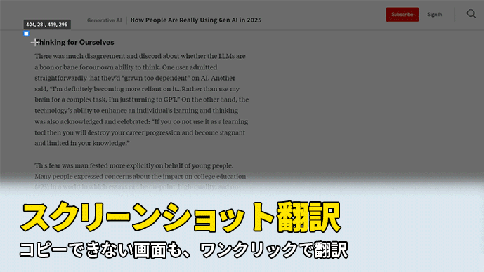マウスで画面をスクリーンショットするだけで、表示された文字を自動で読み取り、即翻訳してくれます。外国語の資料やSNS投稿、YouTubeの画面など、通常の翻訳ツールでは対応できなかった情報にも、マウスひとつで対応可能。