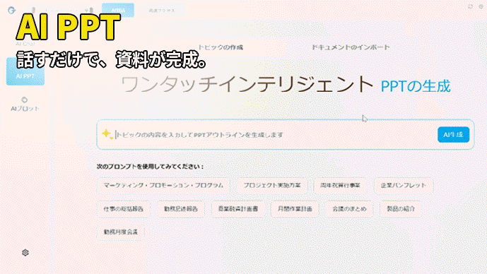 「3分でサービス紹介スライドを作りたい」、「会議用に要点だけまとめたい」などの指示に、AIが瞬時に対応します。スライドタイトル、箇条書き、構成案まで一括で出力されるため、ゼロからパワポを作る負担を大幅に軽減。
