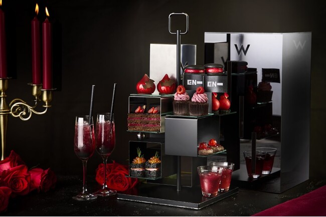 「EN-CHANTED BITE」は、ENHYPENのアイコニックな“ヴァンパイア”コンセプトを洗練された形で表現した特別なアフタヌーンティーです。ネーミングには、グループ名の“EN-”を取り入れるとともに、ヴァンパイアを象徴する“Bite” と、アフタヌーンティーのように一口サイズのスイーツを楽しむ“ひと口”の意味を重ね合わせた言葉遊びが込められています。 シックでどこか謎めいたニュアンスを帯び、ENHYPEN特有のコンセプトを深く取り入れています。W大阪仕様のブラックボックスのティースタンドは、シネマティックなエレガンスと豊かな味わいを融合し、ムーディでスタイリッシュな体験を演出。アフタヌーンティーを通して、ハイファッションのノワールを思わせる芸術的な表現で、ファンの感性に響く没入型のストーリーテリングをお楽しみいただけます。