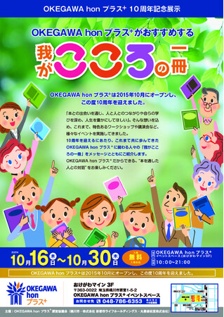 丸善雄松堂株式会社(本社:東京都中央区/代表者:代表取締役 矢野正也/以下:丸善雄松堂)は桶川市(埼玉県桶川市/市長 小野 克典氏)より業務を受託しているOKEGAWA hon プラス⁺(桶川市)において、OKEGAWA hon プラス⁺10周年記念展示「OKEGAWA hon プラス⁺がおすすめする我がこころの一冊」を10月16日(木)~30日(木)に開催いたします。