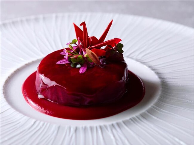 ■真っ赤なシュークルトと畑の恵みのシャルキュトリー 香ばしく焼いた野菜のブイヨンと赤いあしらい(写真上): 秋の深まりを思わせる、ビーツで染め上げた赤いひと皿。折り鶴は、そのモチーフに平和への祈りを込め、野菜の端材から作られたシートで一羽ずつ手作り。