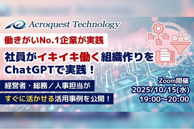 アクロクエストテクノロジー株式会社(本社:神奈川県横浜市・代表取締役:新免流、以下、アクロクエスト)は、中小企業の経営者・総務/人事担当を対象とした「【働きがいNo.1企業が実践】社員がイキイキ働く組織のChatGPT活用法」セミナーを2025年10月15日(水)にオンライン開催いたします。