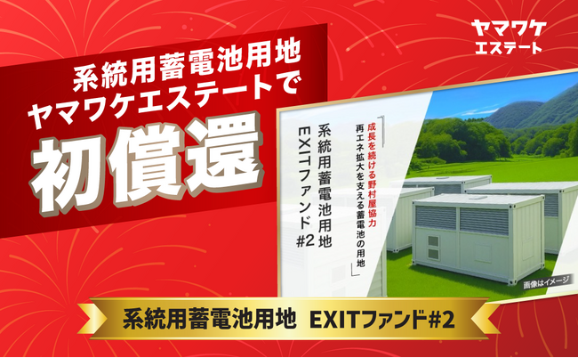 不動産クラウドファンディングサービスを展開する「ヤマワケエステート株式会社」(本社:大阪府大阪市、代表取締役:梅本 拓磨、以下当社)は、当社がファンドを組成した 『系統用蓄電池用地 EXITファンド#2』 がヤマワケエステート初の償還及び配当が完了したことをお知らせいたします。