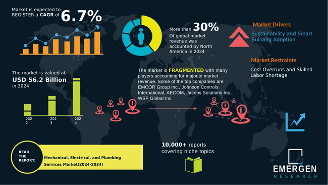 世界の機械・電気・配管(MEP)サービス市場は、2024年に562億米ドルと評価され、2034年までに1,085億米ドルに達すると予測されており、予測期間中に6.7%のCAGRを記録します。
