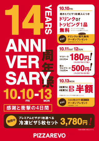 株式会社PIZZAREVO(所在地:福岡県福岡市、代表取締役社長:藤井 邦彦)は、10月11日(土)に創業14周年を迎えるにあたり、「PIZZAREVO 周年祭」を開催いたします。お客さまへの日頃の感謝を