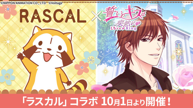 株式会社ボルテージ(本社:東京都渋谷区 代表取締役:津谷 祐司)は、提供中のボル恋タイトル「誓いのキスは突然に Love Ring」(以下「誓キスLR」)が日本アニメーション株式会社(本社:東京都中央区 代表取締役:石川 和子)がアニメーション制作・ライセンス管理を行う「あらいぐまラスカル」のキャラクター「ラスカル」とのコラボレーション企画を実施することをお知らせいたします。