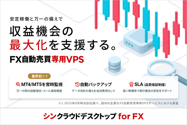 FX自動売買専用VPS『シンクラウドデスクトップ for FX』は、2025年9月30日(火)、業界初(※1)となる「自動バックアップ」機能、「MT4/MT5の監視」機能、「MT4/MT5の自動復旧と通知」機能の提供を開始しました。本機能により、利用者はバックアップによる安心に加え、取引環境の監視から復旧・通知までを一貫して利用でき、より安定した取引環境を実現できます。