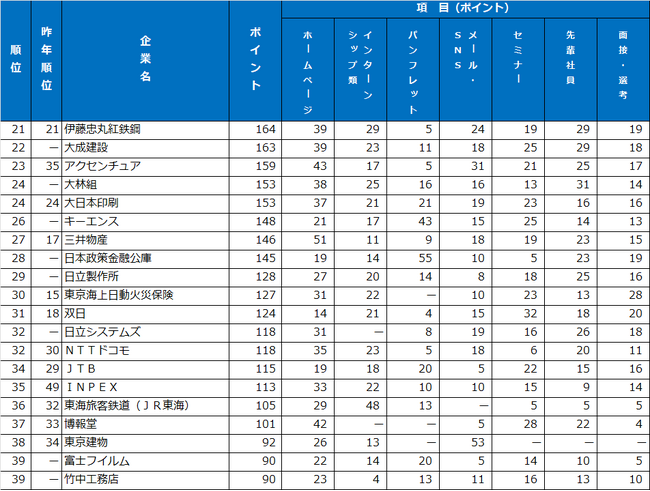 『新卒採用力ランキング調査』では、企業の採用広報、選考活動を(1)ホームページ (2)インターンシップ類 (3)パンフレット・入社案内 (4)メール・SNS (5)セミナー・説明会 (6)先輩社員・懇談会 (7)選考・面接 の7つの分野ごとに学生の評価を聞いています。そして、各分野のポイント合計を企業の「新卒採用力」と定義し、総合ランキングを出しています。