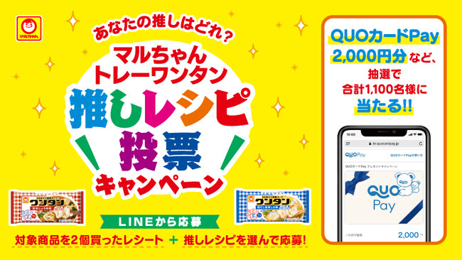 株式会社クオカード(以下当社、本社:東京都中央区、代表取締役社長:近田 剛)が展開するスマートフォンで使えるデジタルギフト「QUOカードPay(クオ・カード ペイ)」は、東洋水産株式会社が10月1日(水)より開催する「マルちゃん トレーワンタン“推しレシピ投票キャンペーン”」で採用されました。本キャンペーンでは、期間中に対象商品を2個購入し、LINEでアンケート回答の上、推しレシピに投票・購入レシートを撮影して応募すると、QUOカードPay2,000円分などが合計1,100名様に抽選で当たります。