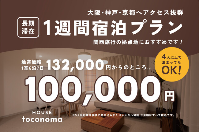 株式会社TSUDA CONSTRUCTION COMPANY(所在地:大阪市東淀川区、代表取締役:津田 直樹)が運営する民泊施設「HOUSHINnoma」(https://toco-noma.com/)は、新たに1週間宿泊プランを提供開始いたしました。催事の出店や出張などで関西エリアに長期滞在を予定される方に、快適かつお得にご利用いただける内容となっております。