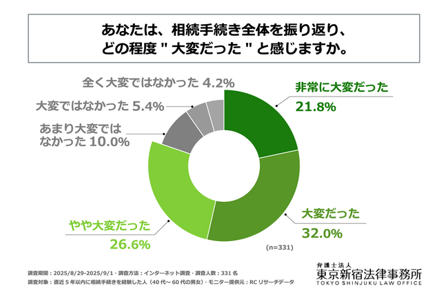 直近5年以内に相続手続きを経験した40代~60代の男女の8割以上が、手続き全体を振り返り、少なからず大変だったと感じている!弁護士法人 東京新宿法律事務所が「相続手続きの大変さに関する調査」を実施!