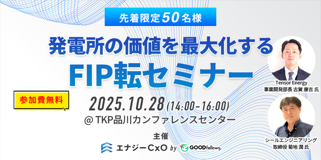株式会社グッドフェローズ(本社:東京都品川区西五反田7-13-5 DK五反田ビル8階、代表取締役:長尾 泰広)は、エネルギー業界のCxO限定クローズドコミュニティ「エナジーCxO」の創設準備セミナーとして、FITからFIPへの転換により発電所の価値最大化を目指す実践型セミナー「発電所の価値を最大化する FIP転換セミナー」を、2025年10月28日(火)にTKP品川カンファレンスセンターで開催します。参加は先着50名・無料(懇親会は有料:7,150円・税込)です。業界の第一線で活躍する専門家が、最新動向と実務ノウハウを解説します。