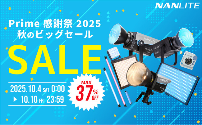 映像制作のプロフェッショナル向け撮影用ライト NANLITE、NANLUX LEDライトの総代理店であるVANLINKS株式会社は、Amazonで 10月4日(土)0:00~10月10日(金)23:59に開催される「Amazonプライム感謝祭」と「Amazonプライム感謝祭先行セール」に参加いたします。「NANLITE」「GUTEK」「BENRO」製品を最大37%OFFのセール価格で販売いたします。