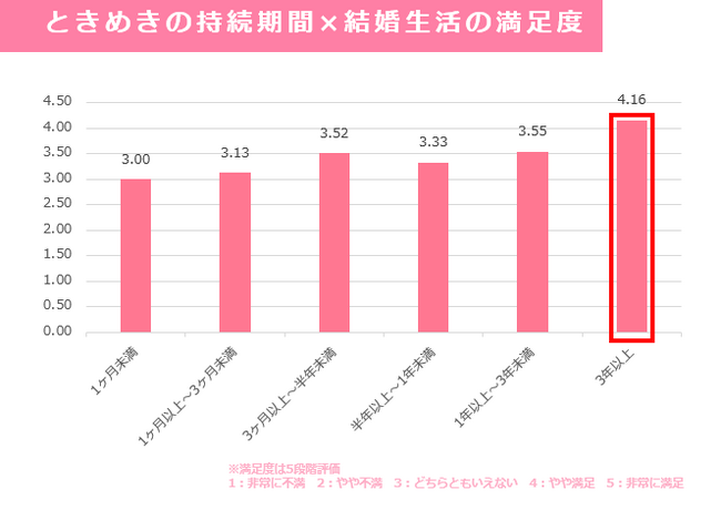 その結果、「3年以上続いた」夫婦は結婚満足度が平均4.16(5段階評価)と非常に高く、 「半年~1年未満」で終わった夫婦(3.33)、「1か月未満」で終わった夫婦(3.00)を大きく上回りました。