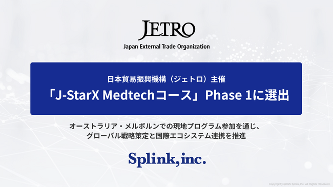 株式会社Splink(本社:東京都港区、代表取締役:青山 裕紀、以下「当社」)は、日本貿易振興機構(ジェトロ)主催の「J-StarX Medtechコース」プログラムのPhase 1に選出されました。当社は、昨年度の「HealthTech Gateway “AI Medical in the US”」に続き、連続で選出されています。