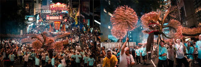 大坑ファイヤー・ドラゴン・ダンスは1880年に村の長老の夢に龍が現れたことをきっかけに始まった、香港の文化を象徴する伝統行事のひとつです。龍は、真珠草、籐の枝、麻縄を用いて1か月かけて製作され、頭部の重量は約50キログラムに及びます。また32の関節で構成され、煙をまといながら魅惑的な舞を繰り広げます。この伝統儀式は、中国の国家級無形文化遺産に登録されており、地域社会の「祝福・健康・平和」を願う象徴として今も受け継がれています。
