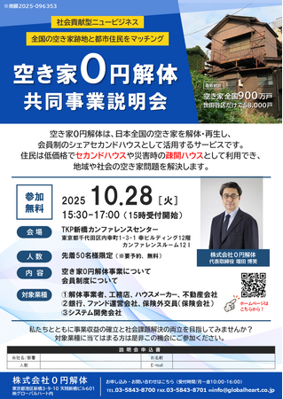 空き家0円解体は、日本全国の空き家を解体・再生し、会員制のシェアセカンドハウスとして活用するサービスです。空き家を0円解体が解体し、更地として売却。解体費用はその売却代金から差し引き、残金を空き家のオーナー様へ返金します。面倒な手続きや工事中の管理責任は全て「株式会社0円解体」が請け負いますので、オーナー様は安心です。住民は低価格でセカンドハウスや災害時の疎開ハウスとして利用でき、地域や社会の空き家問題を解決します。