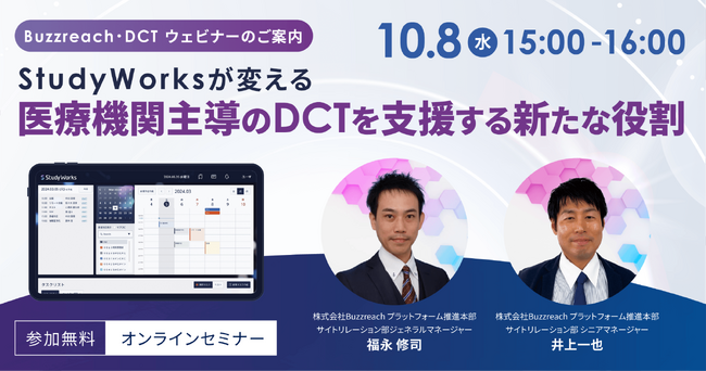 株式会社Buzzreach(本社:東京都港区、代表取締役 CEO:猪川 崇輝)は、医療機関主導型DCT(分散型臨床試験)に関する最新の取り組みを紹介する無料オンラインセミナーを以下の通り開催いたします。