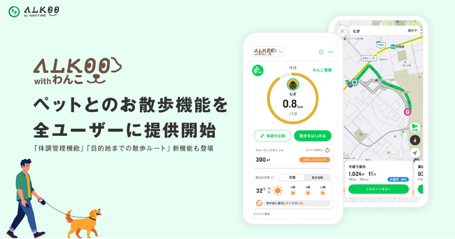株式会社ナビタイムジャパン(代表取締役社長:大西 啓介、本社:東京都港区)は、2025年10月2日(木)より、ウォーキングアプリ『ALKOO by NAVITIME』にて、ペットとのお散歩機能「ALKOO withわんこ」モードを追加し、全ユーザー向けに開放いたします。さらに、「体調管理機能」や、「目的地までの散歩ルート」などの新機能も追加いたします。