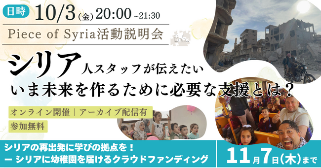 シリアで活動するNGO「Piece of Syria」が、アサド政権崩壊から約1年が経つシリアの状況とこれからの支援について、シリア人スタッフからの声を届けるオンラインイベントを10/3(金)に開催。