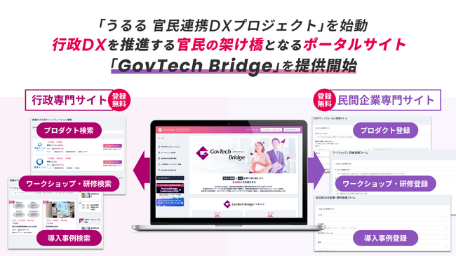 労働力不足問題解決のリーディングカンパニーとして、複数のSaaSを展開する株式会社うるる(東京都中央区 代表取締役社長CEO:星 知也、以下「うるる」)は、官民の協働をIT・AIと人のチカラでエンパワーする「うるる 官民連携DXプロジェクト」 を始動します。その第1弾として行政DXを推進する官民の架け橋となるポータルサイト 「GovTech Bridge(ガブテックブリッジ)」の提供を本日より開始します。