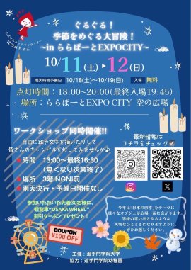 追手門学院大学(略称:追大、大阪府茨木市、学長:真銅正宏)の学生団体「追大Candle Night」は10月11日(土)、12日(日)に、ららぽーとEXPOCITY(大阪府吹田市)「空の広場」で、LEDキャンドルを使った空間演出「ぐるぐる!季節をめぐる大冒険!~inららぽーとEXPOCITY~」を開催する。「四季」をテーマにした展示のほか、ららぽーとEXPOCITYのメインターゲットである家族連れが楽しめるクイズラリーやワークショップも用意している。