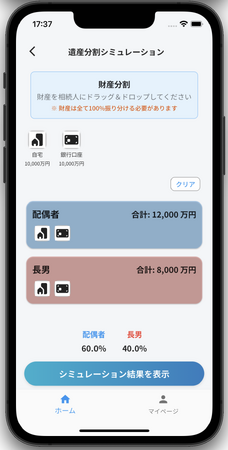本機能では、アプリ内で簡単な操作を行うだけで相続人への財産振り分けや、相続人ごとの相続税と手取り額の目安を確認できます。※本シミュレーションは試算であり、実際の遺産分割や税額を保証するものではありません。