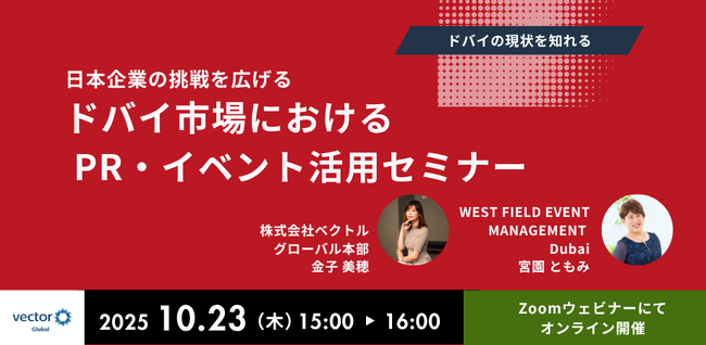 株式会社ベクトル(本社:東京都港区、代表取締役会長兼社長CEO:西江 肇司、東証プライム:6058、以下ベクトル)は、ドバイ市場をテーマにしたオンラインセミナー「日本企業の挑戦を広げる ドバイ市場における PR・イベント活用セミナー」を2025年10月23日(木)15:00~16:00に開催いたします。