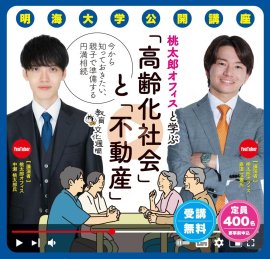 明海大学浦安キャンパス(千葉県浦安市・学長:中嶌裕)では、You Tubeで人気の不動産鑑定士「桃太郎オフィス」中瀬桃太郎氏と泰道征憲氏を講師に迎え、公開講座「桃太郎オフィスと学ぶ『高齢化社会』と『不動産』― 今から知っておきたい、親子で準備する円満相続-」を11月3日(月・祝)に開催する。〔参加費無料、要事前申込〕
