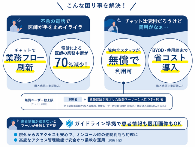 - あらゆる医療機関で、全スタッフ分、無償でチャットが利用可能に