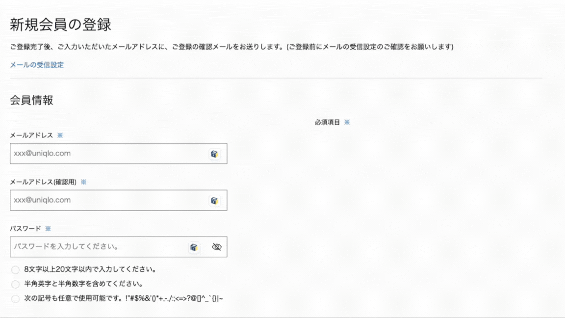Webサービスの新規登録画面上で、ユニークなメールアドレスや強力なパスワードをワンクリックで生成可能。文字数や記号の有無もその場で調整できます。