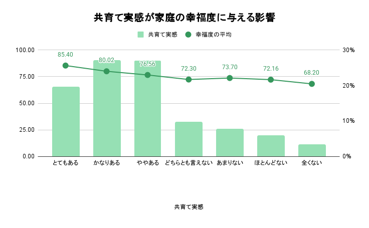 本調査では、「共育て実感がとてもある」と回答した家庭の幸福度が 85.4ptであったのに対し、「全くない」と回答した家庭は 68.2ptとなり、約17pt(約20%)の差があることが判明しました。この結果から、共育ての実感の有無が、家庭全体の幸福度を大きく左右する要因であることが明らかになりました。