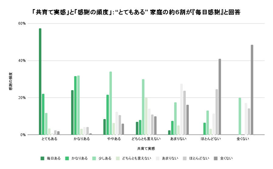 一方で、実感が全くない家庭では「毎日ある」と答えた人はゼロであり、さらに「感謝の頻度があまりない・ほとんどない・全くない」と回答した人が合計で 8割にのぼりました。この結果から、共育て実感や家庭全体の幸福度の高さには、「ありがとう」といった日常的な感謝の言葉の有無が大きく影響していることが明らかになりました。
