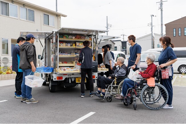 入居者や近隣住民が集まる移動販売車での買い物風景