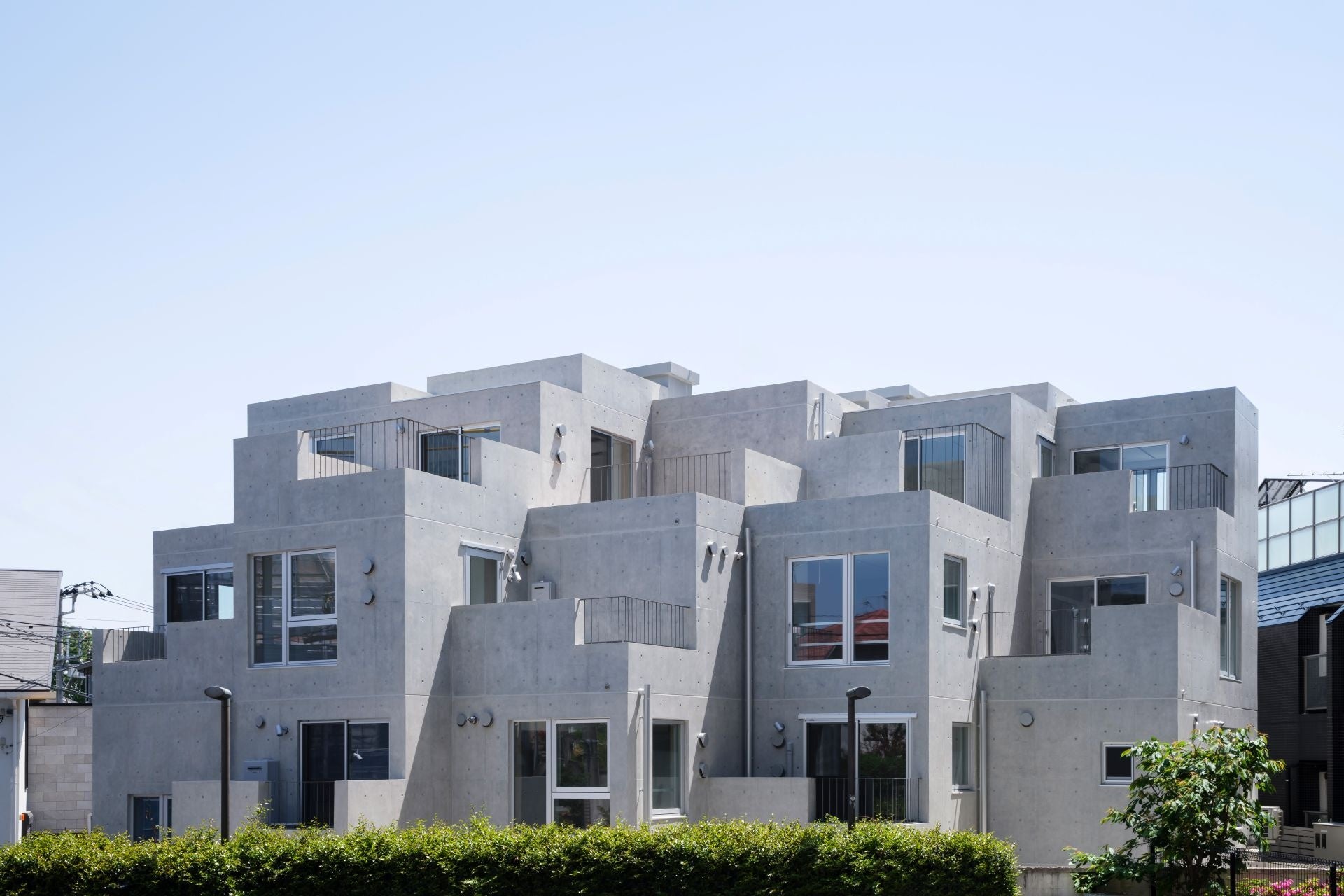 建物を敷地に対して斜めにずらしながら配置する雁行・段状のデザインを採用し、厳しい形態制限の中で建物の容積を最大限確保しながらも圧迫感を抑え、街並みに調和する外観を実現しました。 雁行配置によって外周部に生まれた「小さな庭」を介して、光や風、緑を豊かに取り込みます。各住戸が異なる開口部や眺望を持ち、日常に変化と心地よい余白をもたらします。