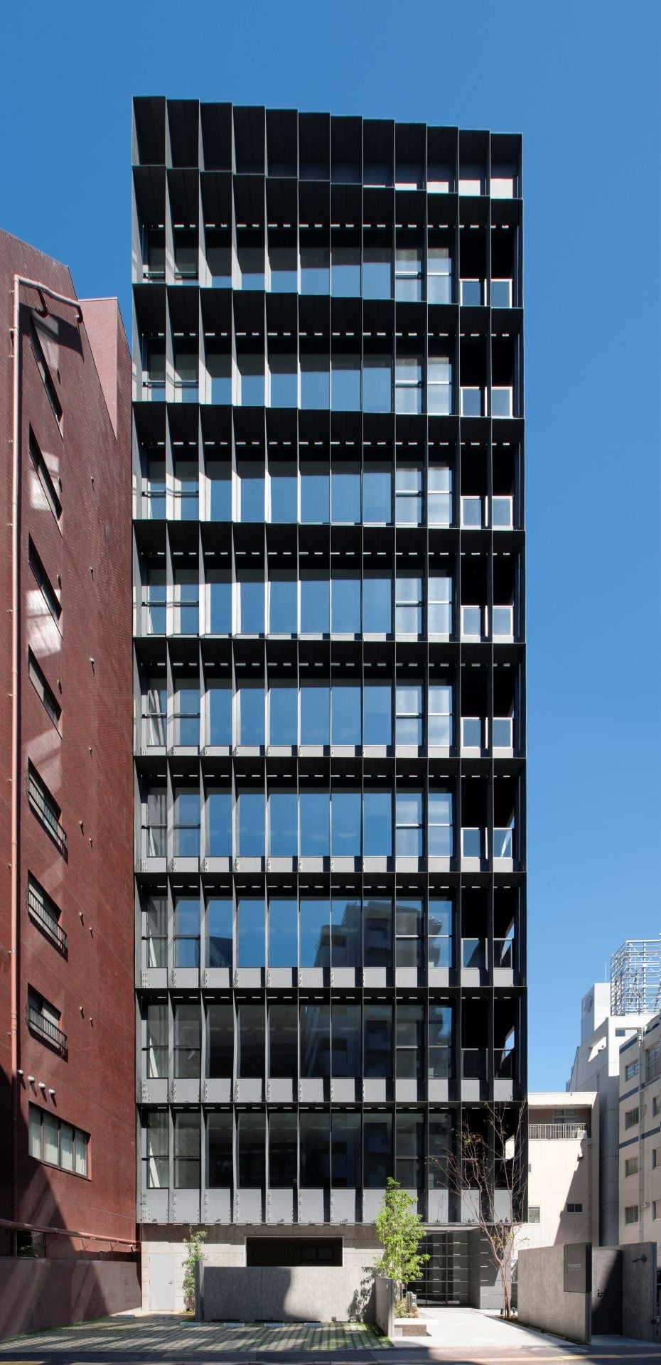 厚さ9mmの鋼板で構成した格子状のルーバーが日射を遮り、快適な室内環境を保ちつつ、街並みに光と陰影のリズムを織り込むファサードを提案しました。外装建材として主流のアルミ材ではなく「鉄」という素材の特性を再評価することでディテールや施工方法に工夫を凝らし、建築技術面からも新たなデザイン表現の可能性に挑みました。