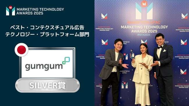 コンテクスチュアル広告のグローバルリーダーであるGumGumは、「マーケティングテクノロジーアワード2025」(主催:MARKETECH APAC)の「ベスト・コンテクスチュアル広告テクノロジー・プラットフォーム(Best Contextual Advertising Tech Platform)」部門でSilver賞を獲得しました。その原動力となったのは、GumGum Japanの革新的な取り組みです。