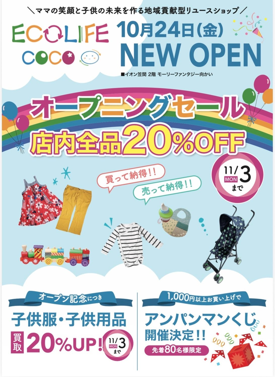子供服リユースショップECOLIFE COCO(エコライフココ)「イオン笠間店」を2025年10月24日(金)にオープンすることが決定いたしました。オープニング記念として店内全商品20%OFF、買取査定額の20%UPを実施いたします。また、かわいいアンパンマンくじも開催。USヴィンテージキッズ古着も数量限定で販売予定です。お子様もママもおトクがいっぱいですのでぜひご来店ください。■イベント開催期間