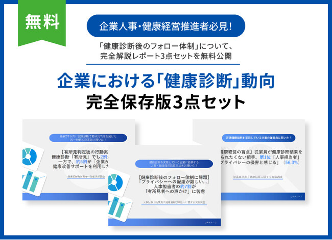 心幸ウェルネス株式会社(本社:兵庫県尼崎市、代表取締役:山崎 忠、以下、心幸ウェルネス)は、2025年7月、8月に公開した「企業の健康診断後のフォロー体制」に関する調査コンテンツをまとめた「企業における『健康診断』動向完全保存版3点セット」を公開しました。