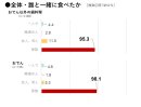 昨年の秋冬(主に令和6年9月から令和7年2月の間)におでん以外の鍋料理とおでん、それぞれ誰と一緒に食べたかについて聞いたところ、おでん以外の鍋料理は95.3%、おでんは98.1%の人が「家族と一緒に食べた」と回答しました。
