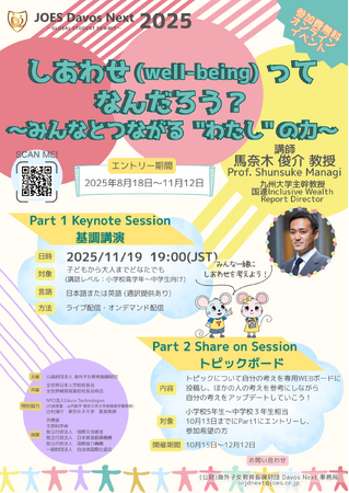 公益財団法人 海外子女教育振興財団は、九州大学主幹教授の馬奈木俊介氏を講師に迎え、JOES Davos Next 2025 ~GLOBAL STUDENT SUMMIT~「しあわせ(well-being)ってなんだろう?~みんなとつながる“わたし”の力~」と題した子ども向けのオンラインイベントを開催します。