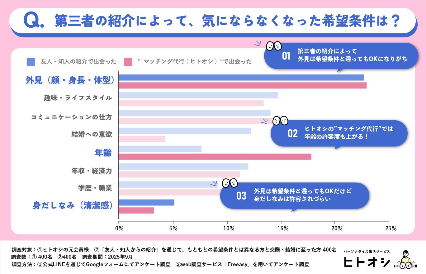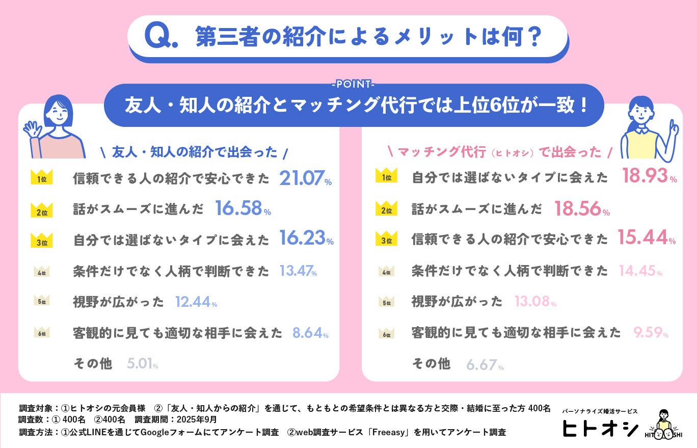 私たちは、“第三者が相手を選ぶ”という新しい婚活スタイルであるマッチング代行の効果を明らかにするため、マッチング代行サービス(ヒトオシ)の元会員400名を対象に調査を行いました。比較対象として、第三者による紹介の一つである「友人・知人からの紹介」を通じて、もともとの希望条件とは異なる方と交際・結婚に至った400名にも同様の調査を行いました。