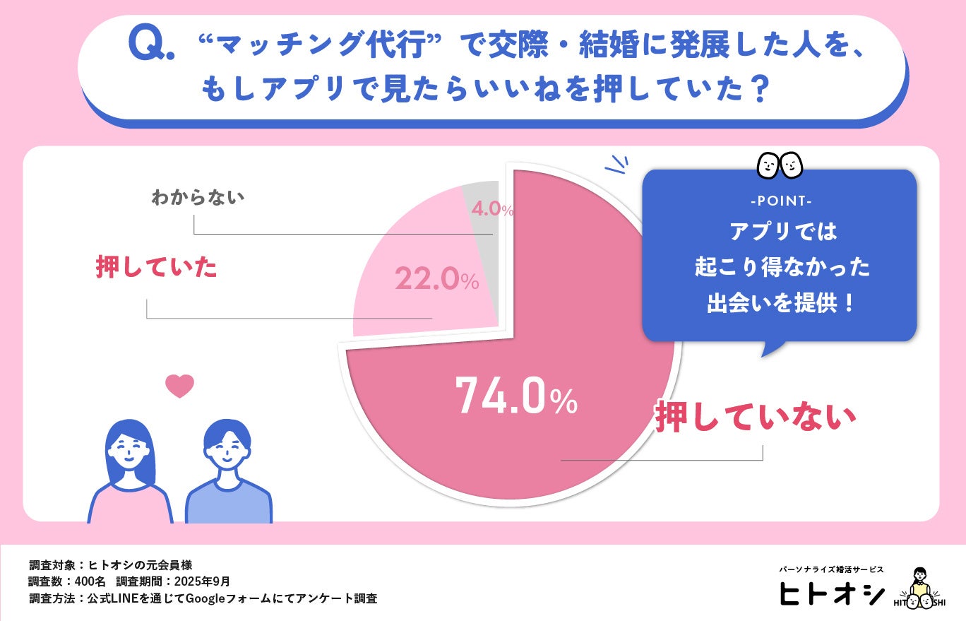 ・マッチング代行で交際・結婚に至った方の70%以上がマッチングアプリで見ても“いいね”を押していなかった」と回答しています。