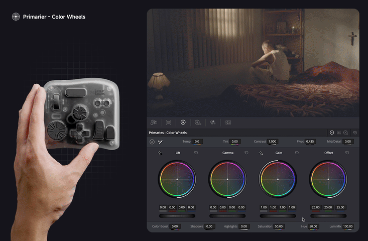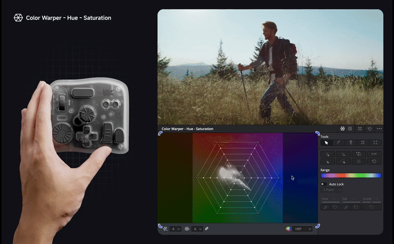 TourBoxはDaVinci Resolve向けに全ページ対応のカーソル位置調整機能をリリースしました。マウスカーソルをカラーサークル、スライダー、トーンカーブ、入力欄などに移動すれば、TourBoxはその項目を認識し、ノブの回転でパラメータを調整できるようになります。カーソルを他の位置に移動すると、ノブの機能も元の設定に戻ります。
