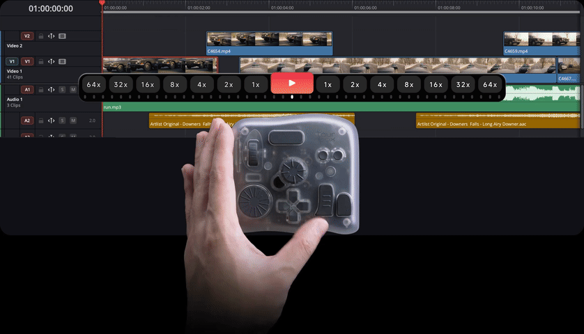 1倍速から64倍速までに対応。一発で最高速度に切り替えるのもOK!TourBox Consoleで速度を自由選択でき、たとえば 2x/16x/64xのみを設定するのもできます。ノブを回す時は設定した速度の間に切り替えて、UI上でも速度を即時に表示します。