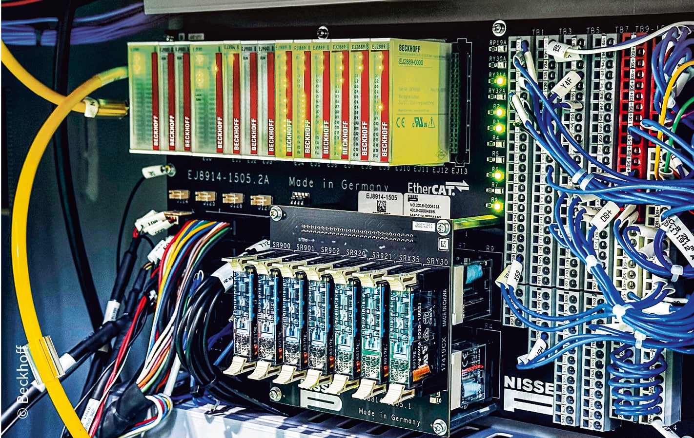 日精樹脂工業は、「EJモジュール」という汎用基板上に複数のIO機能を実装した専用モジュールを採用した(写真上部)。EJモジュールは必要なIO機能を1枚のボードにまとめられるため、IO部のコンパクト化とコスト削減のメリットがある。(写真提供:ベッコフオートメーション)